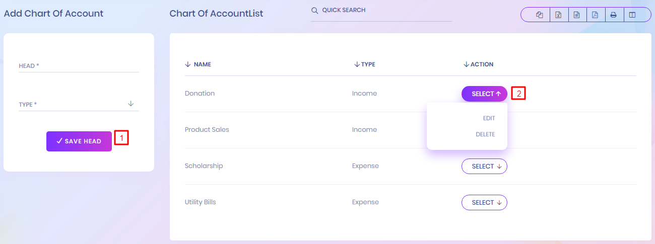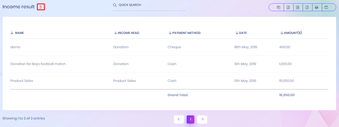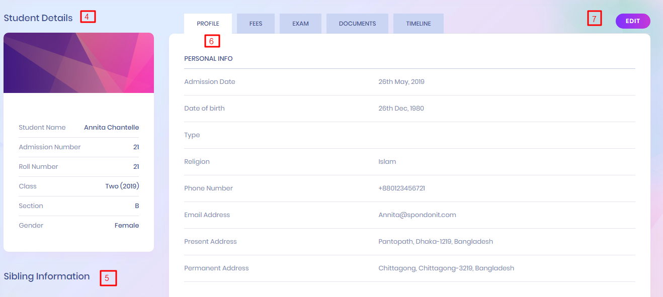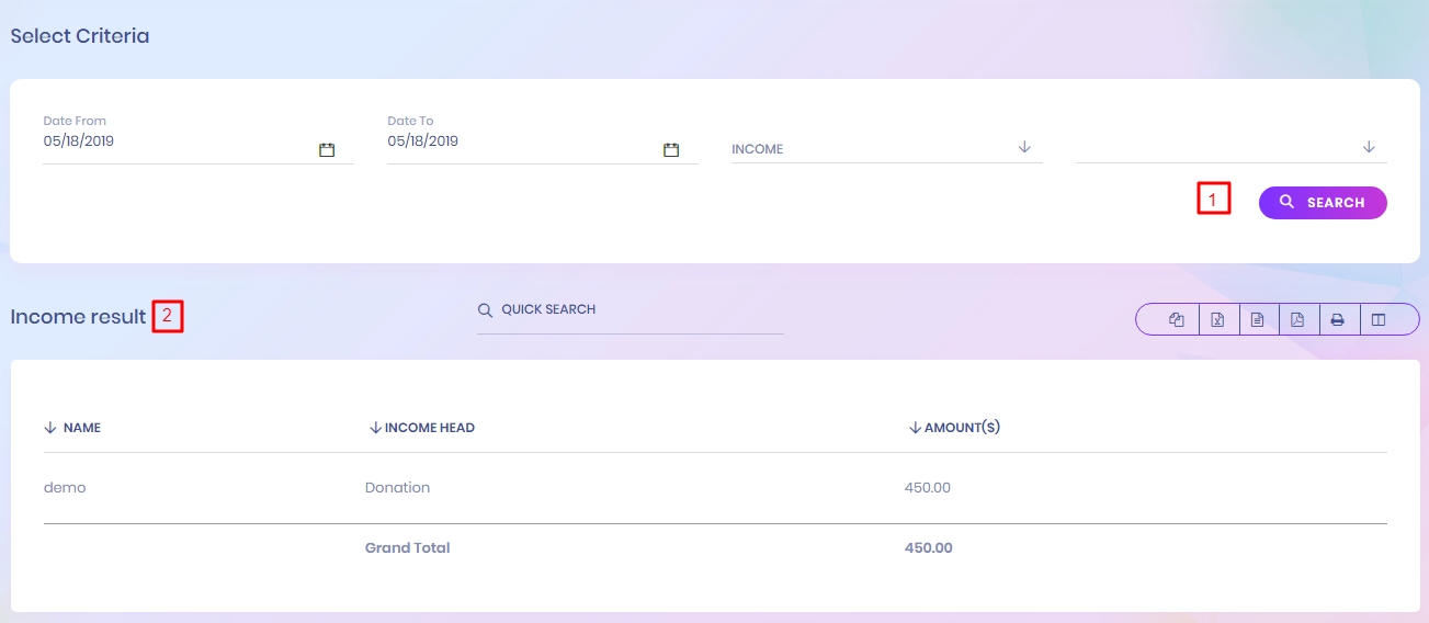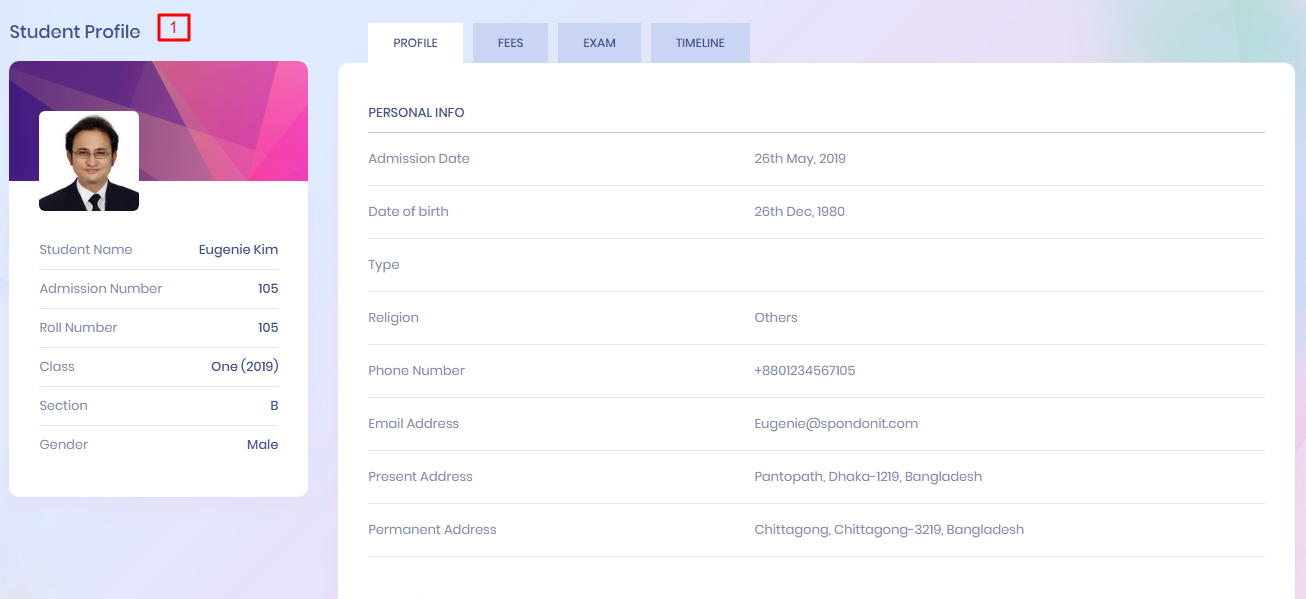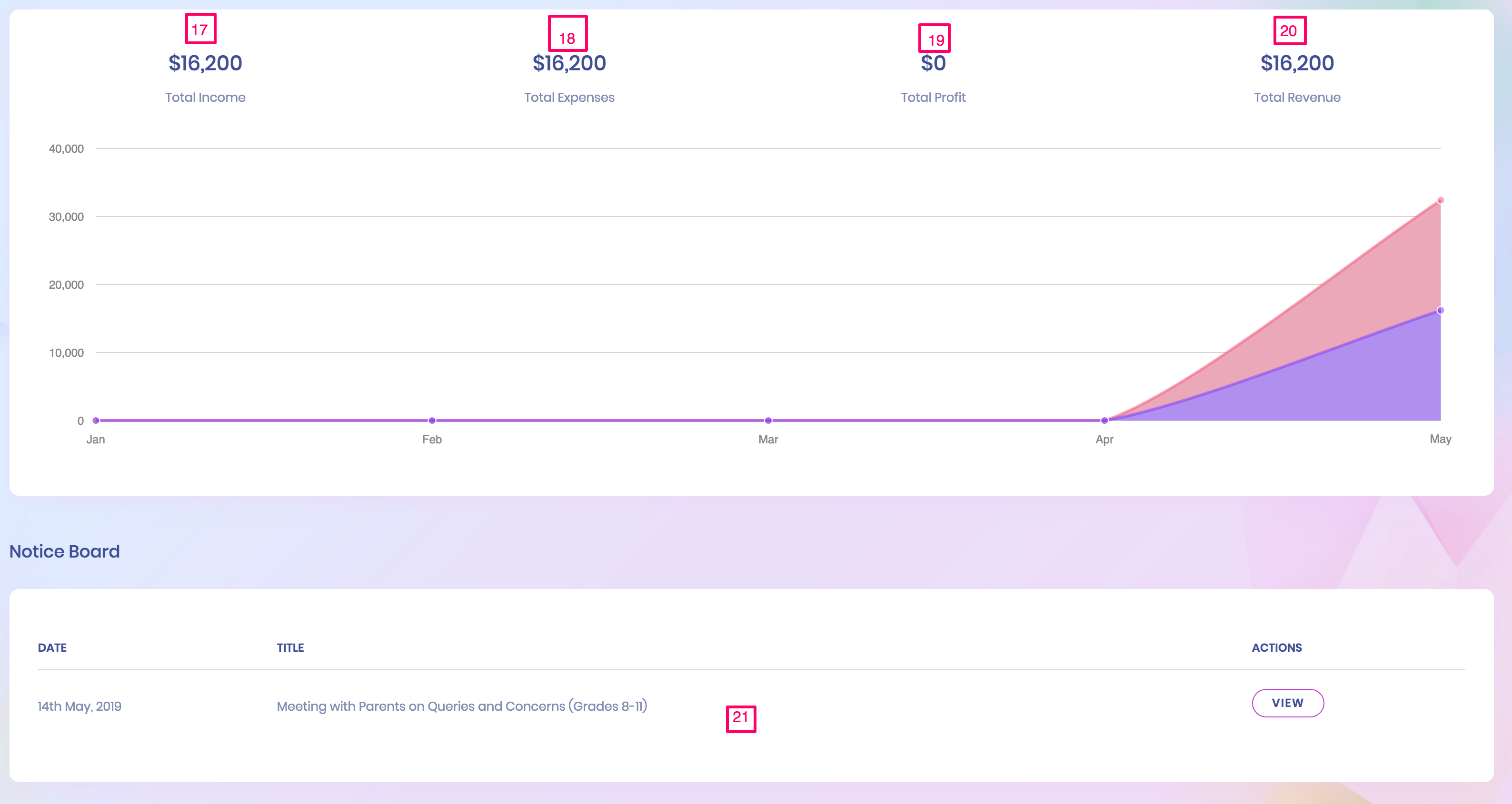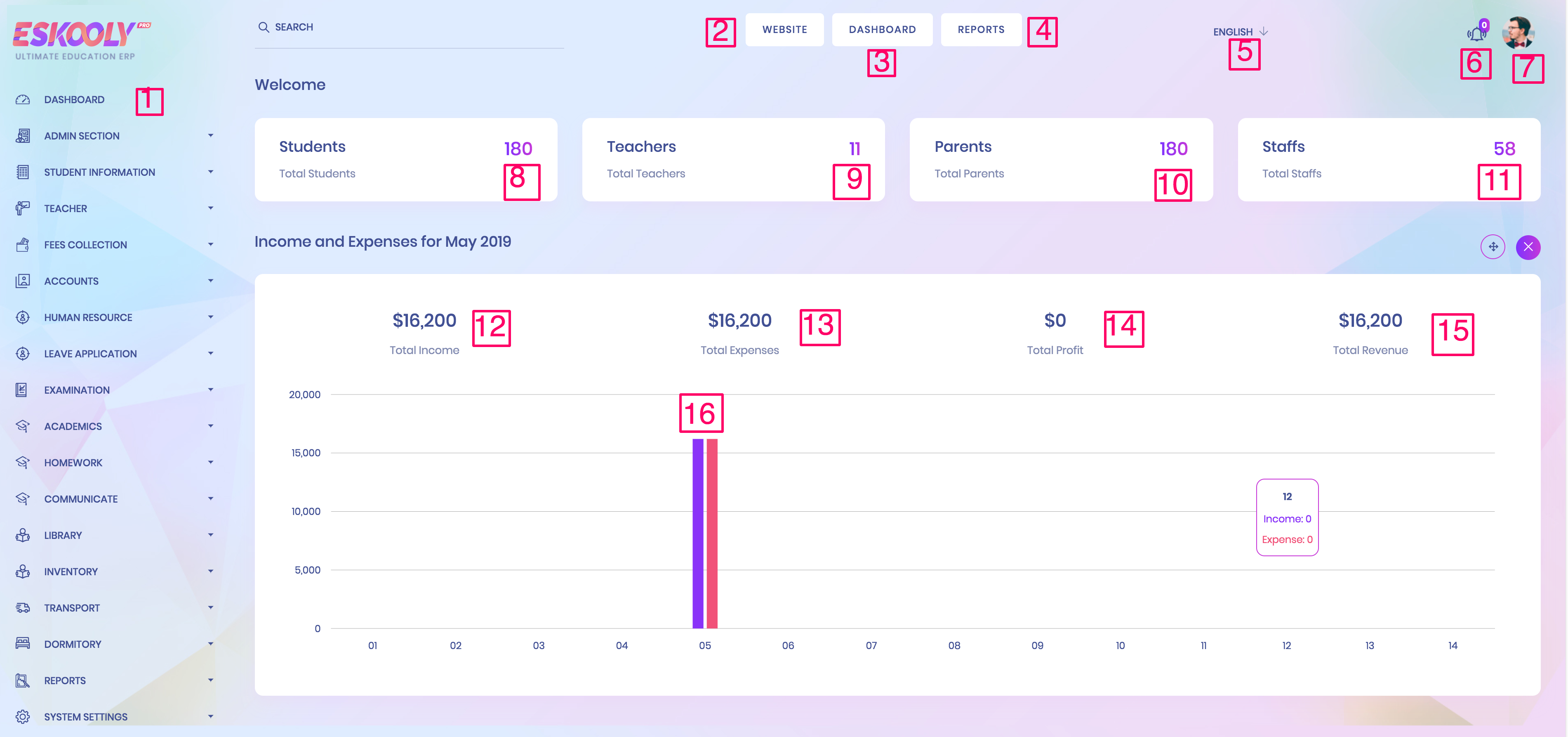 At the top menu of left sidebar is Dashboard. There are several view port in dashboard. we can see the number of students, teachers and staff etc. at a glance. Summary of the Income and Expenses is very important for ERP system. After login a user can see the update for that day.