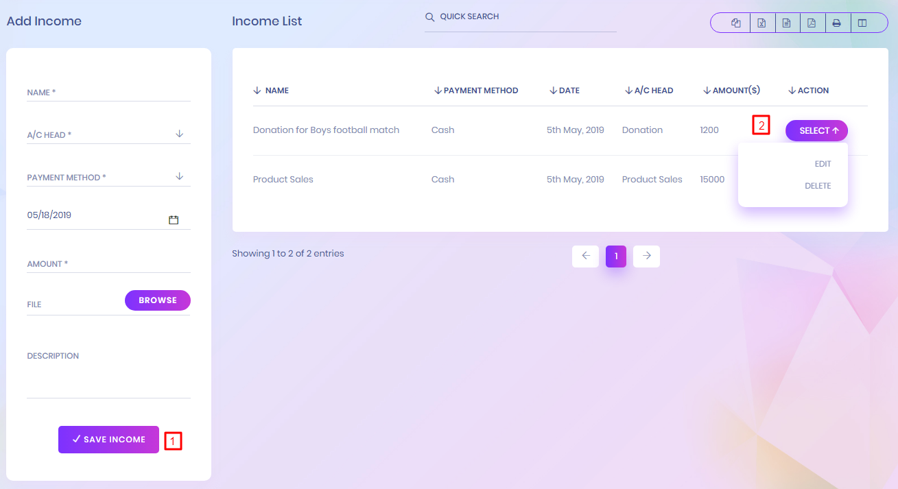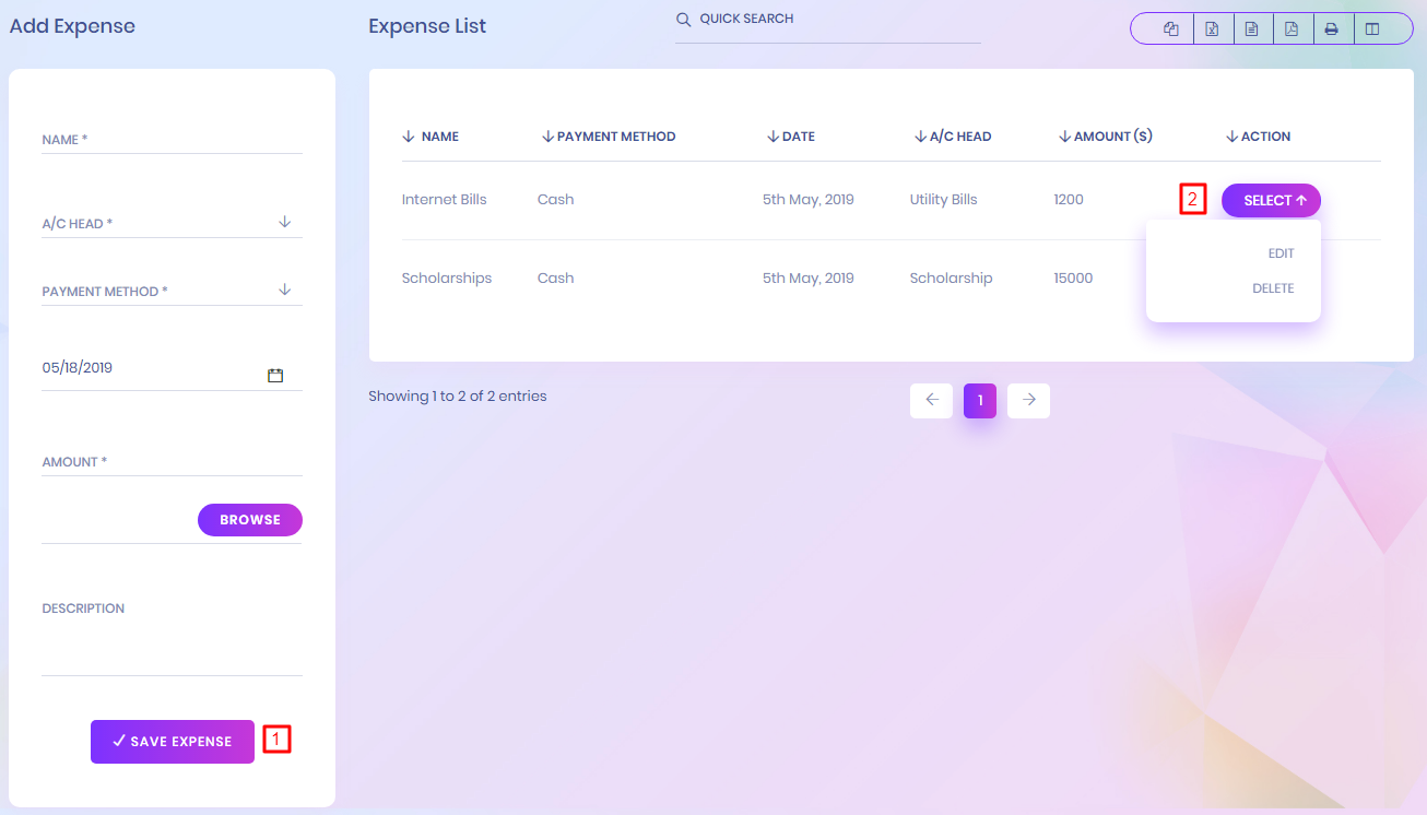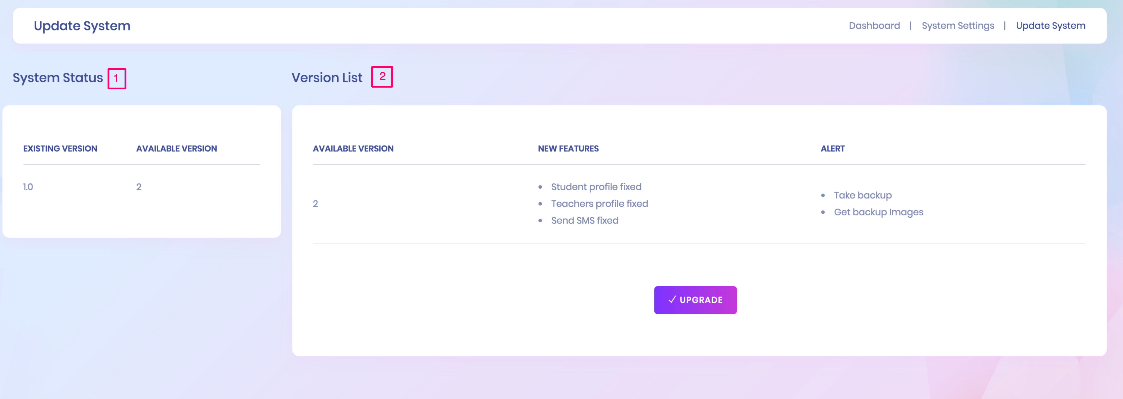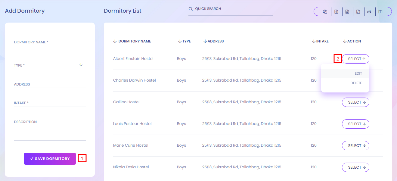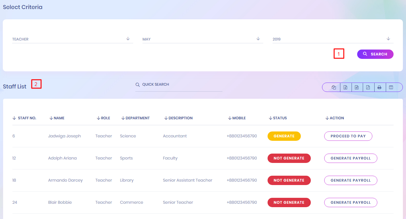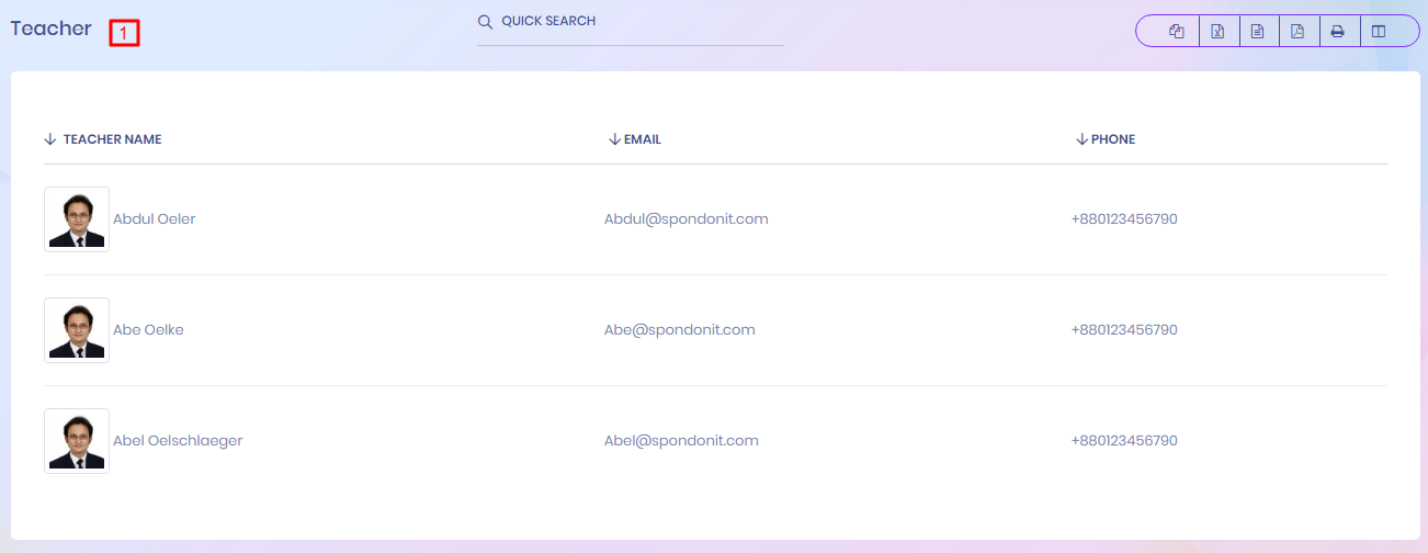 At the top menu of left sidebar is Dashboard. There are several view port in dashboard. we can see the number of students, teachers and staff etc. at a glance. Summary of the Income and Expenses is very important for ERP system. After login a user can see the update for that day.