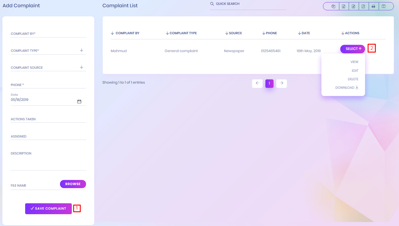 In the complaint list several actions are included which are view the complaint details, edit and delete.