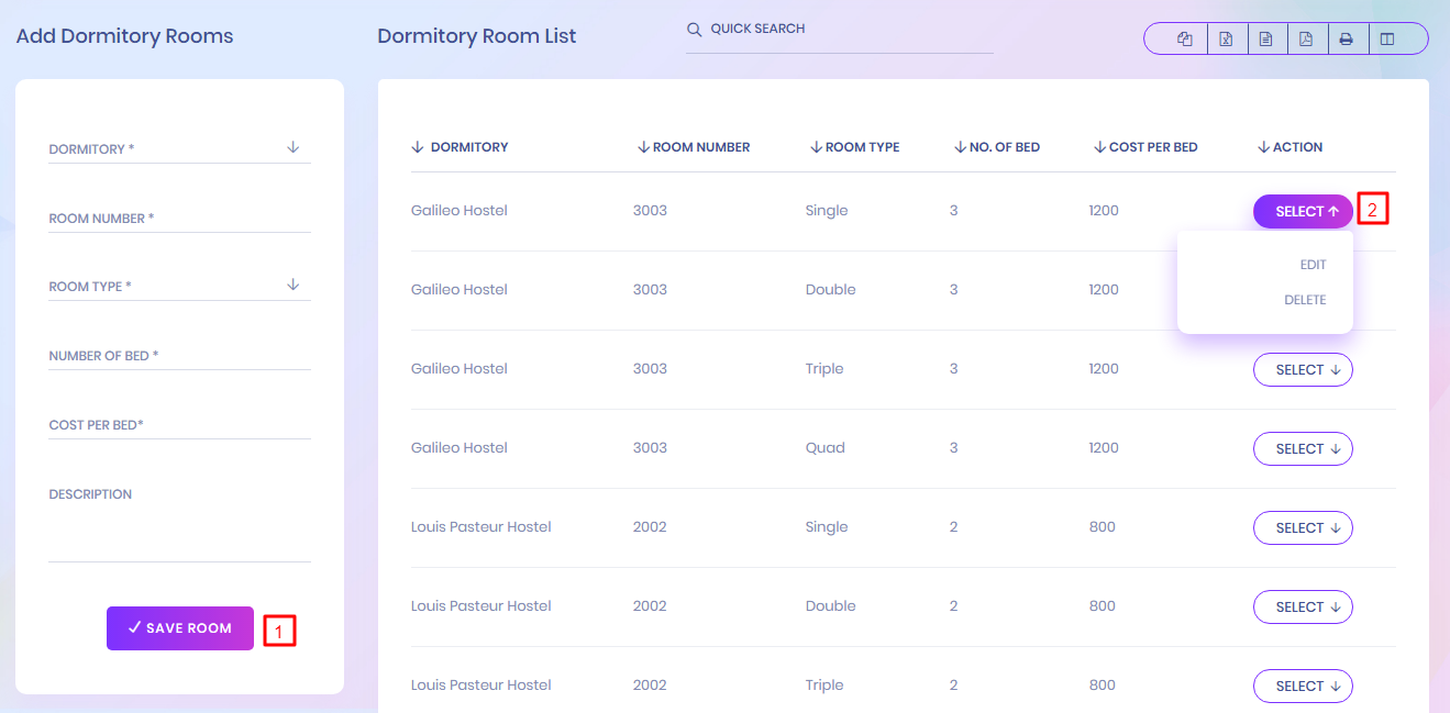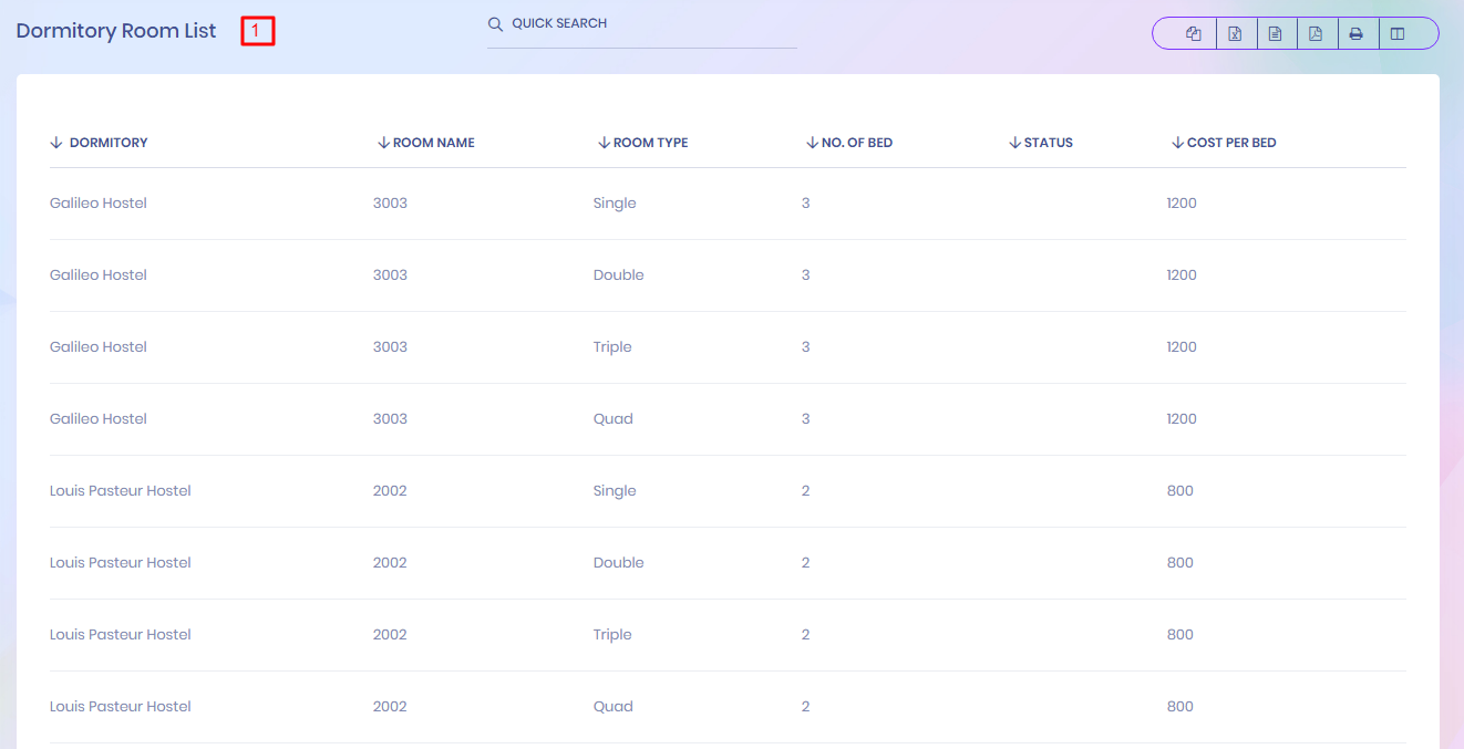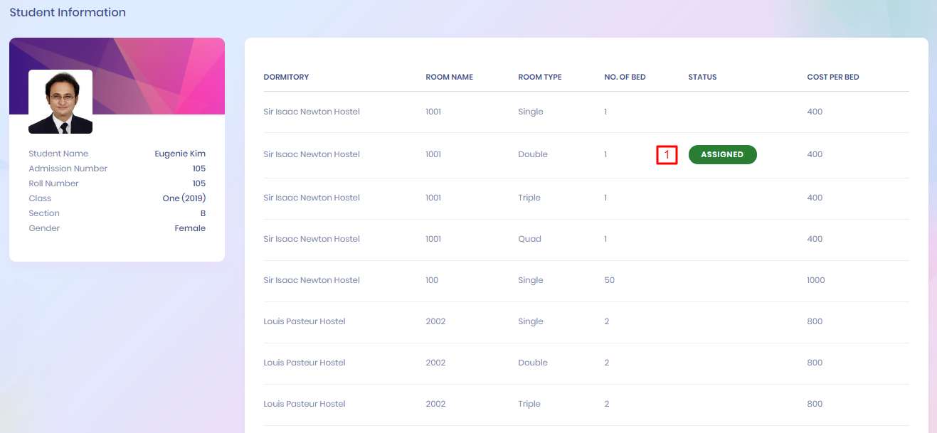 Dormitory and it's room information with which room is assigned for the student is listed here.