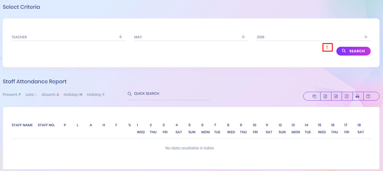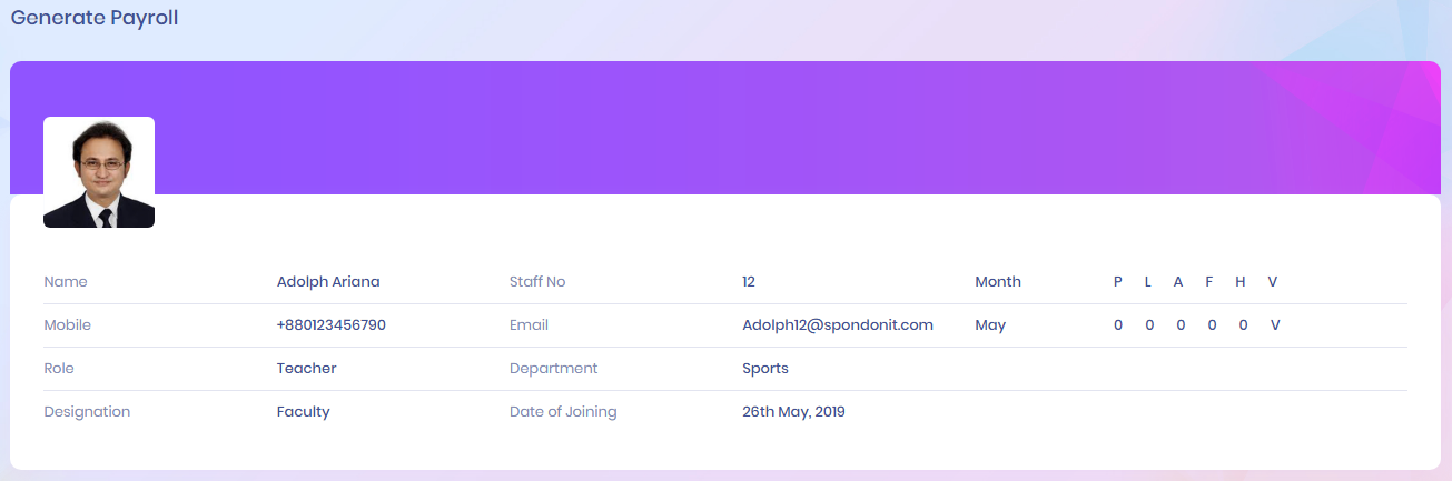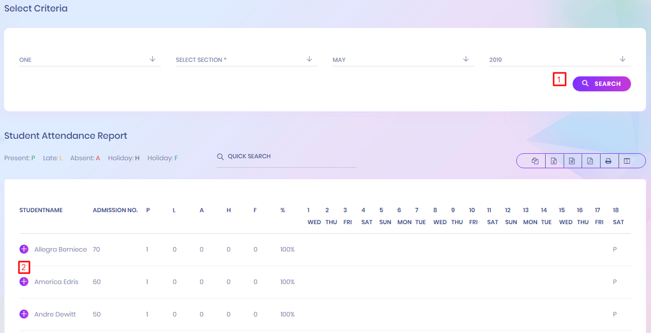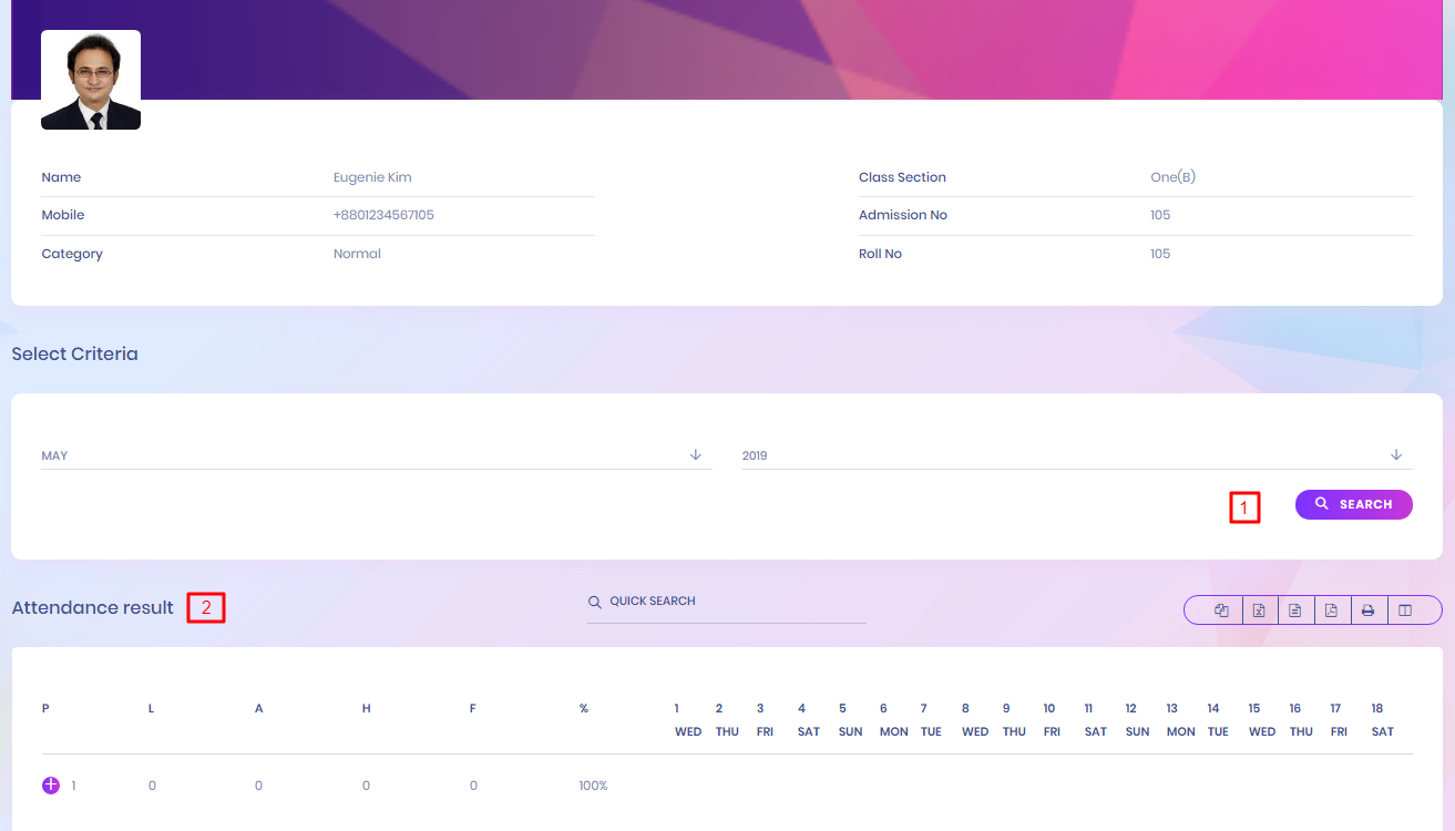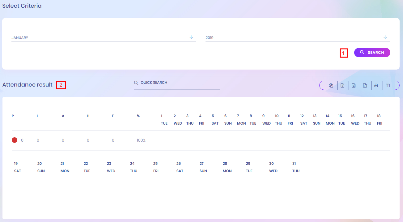 In this section attendance results are shown.Attendance result show the certain month attendance which is remarked by present(P),late(L),absent(A),Half Day(H) and Holiday(F)