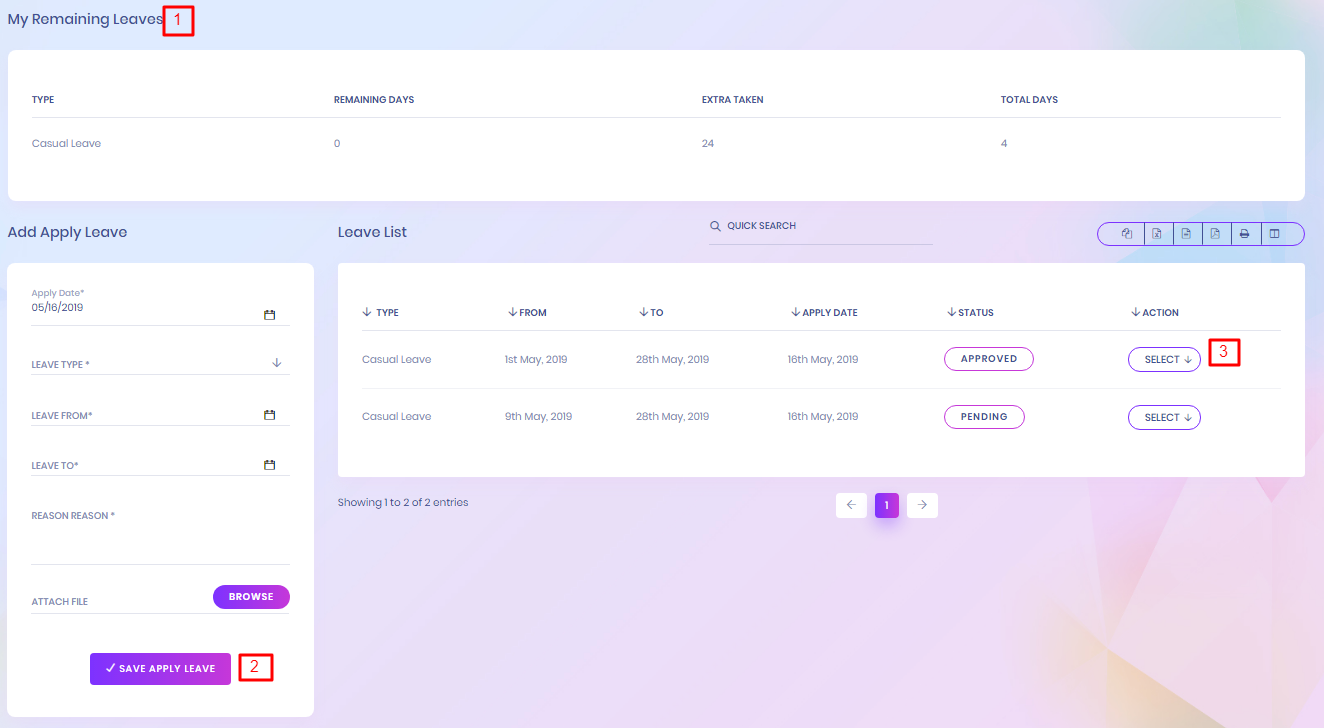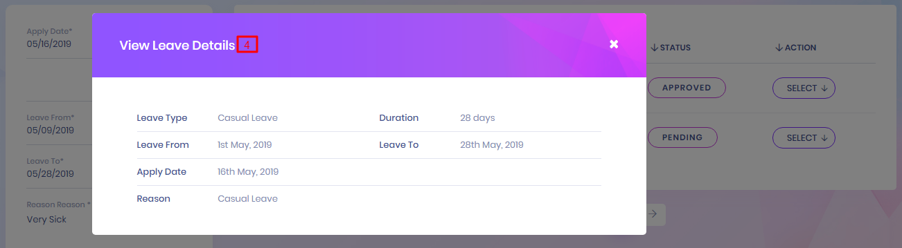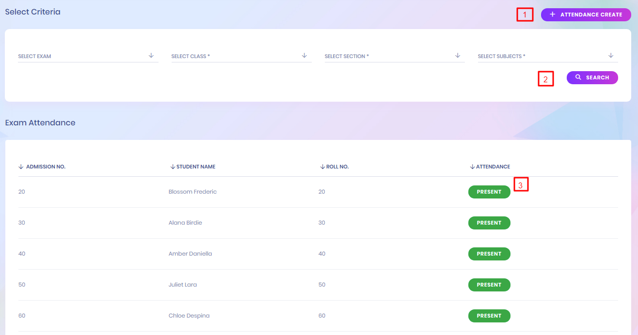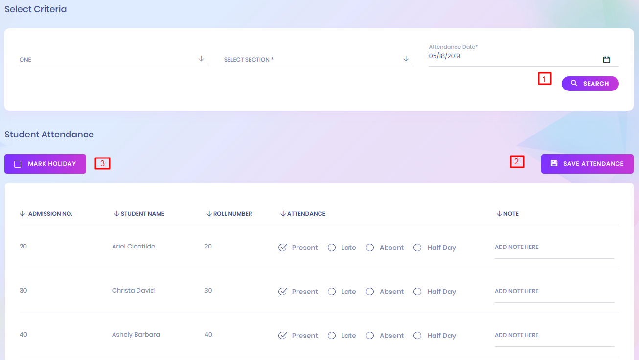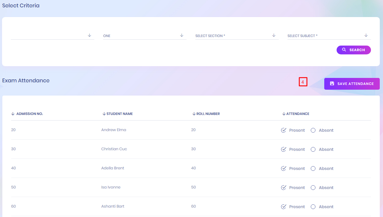 In this section attendance results are shown.Attendance result show the certain month attendance which is remarked by present(P),late(L),absent(A),Half Day(H) and Holiday(F)