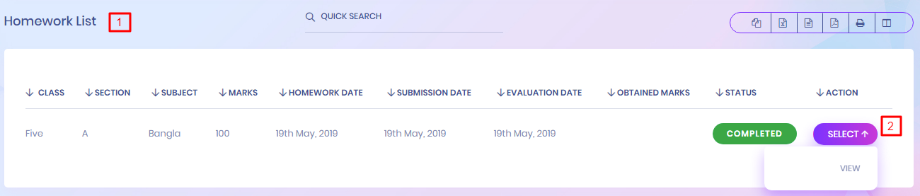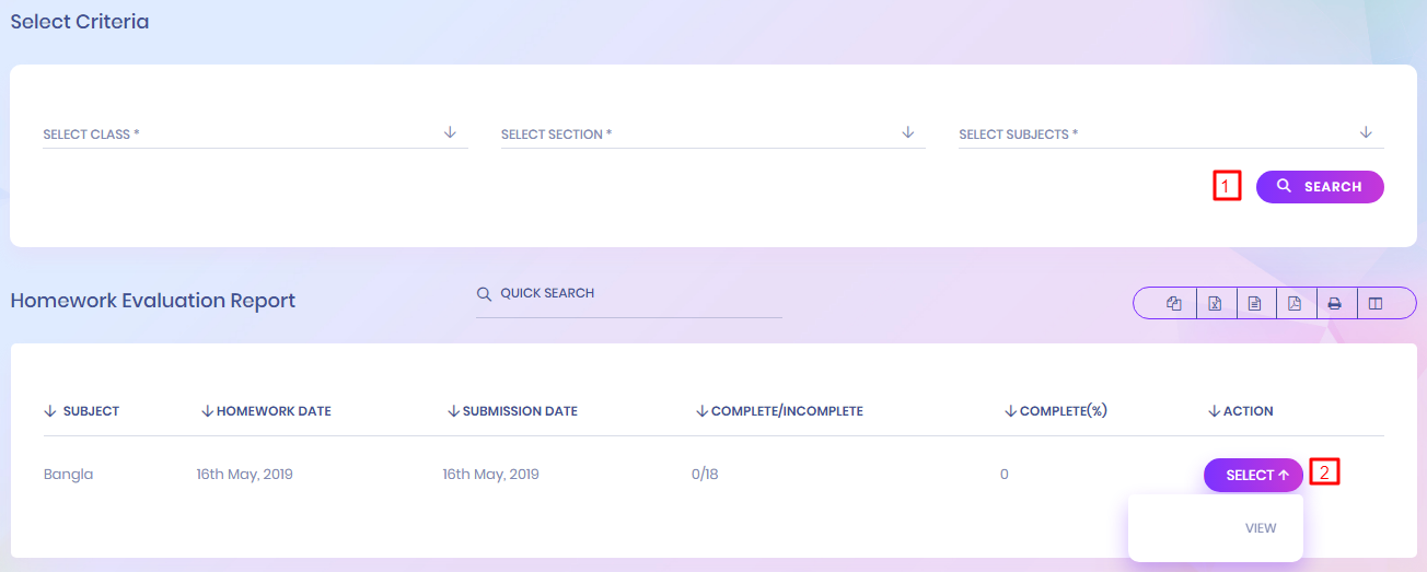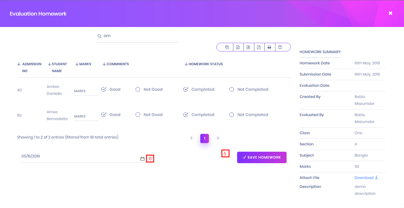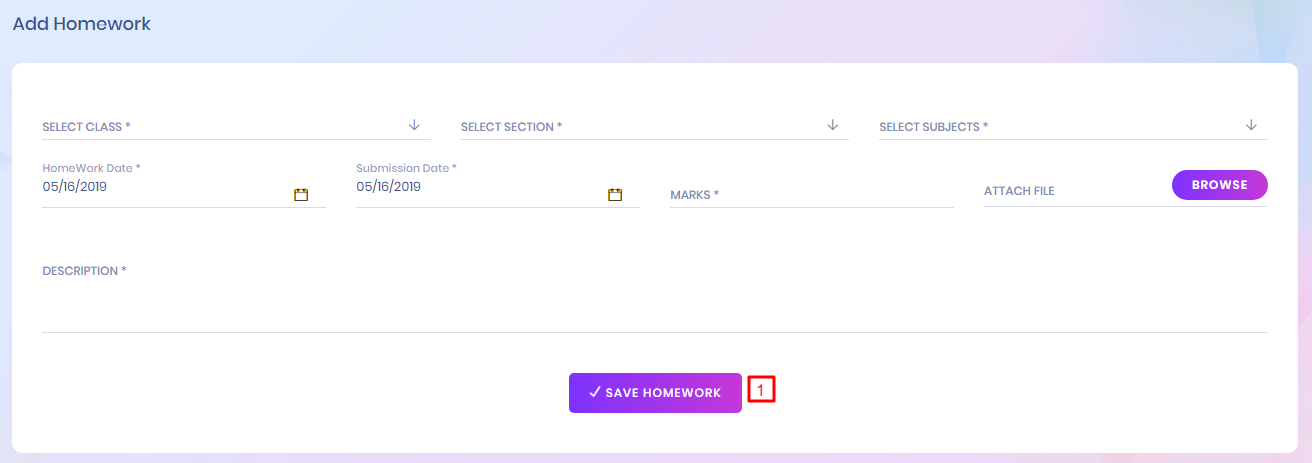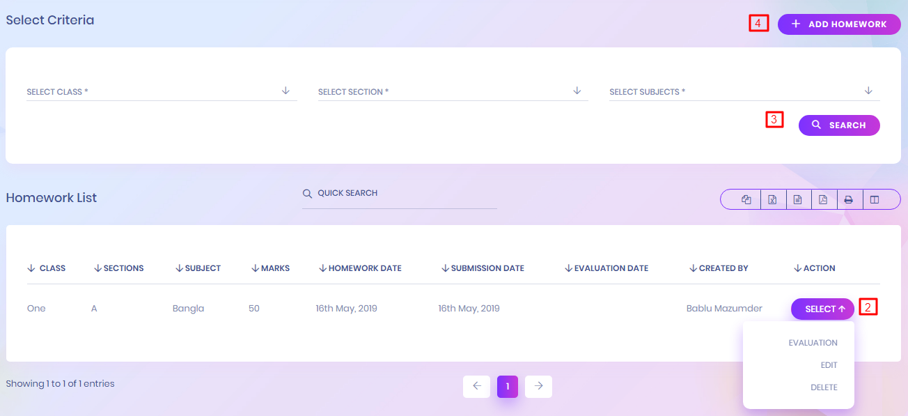 Here Teachers can create Homework for their Class-Section. After creating homework teachers can evaluate homework for class-section students that who has completed homework or not completed. First we will Add Homework then we will evaluate homework. Homework- Go to Homework > Add Homework Here you can see all previously created homework and search them different criteria.