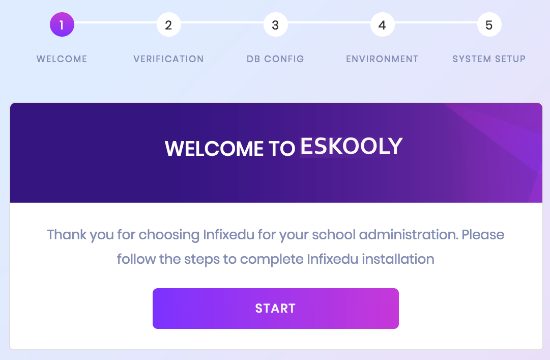 - Use your browser to eSkooly install Script . Type in browser your application location followed by /install. and hit Start Installation