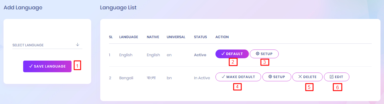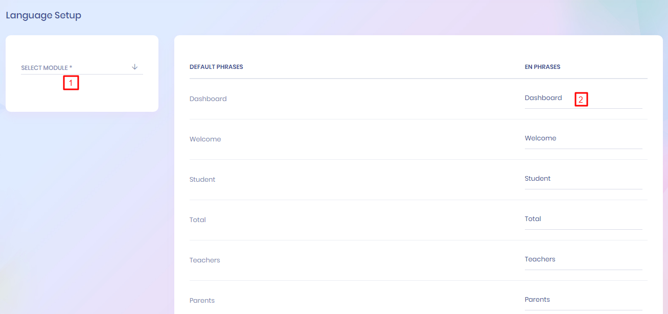 eSkooly delivered to you equiped with diffrent languages : English, Arabic (RTL), French, Dutch, German, Hindi, Italian, Turkish,Russian, Spanish & Portuguse etc. You can also add laguage with your own customization.